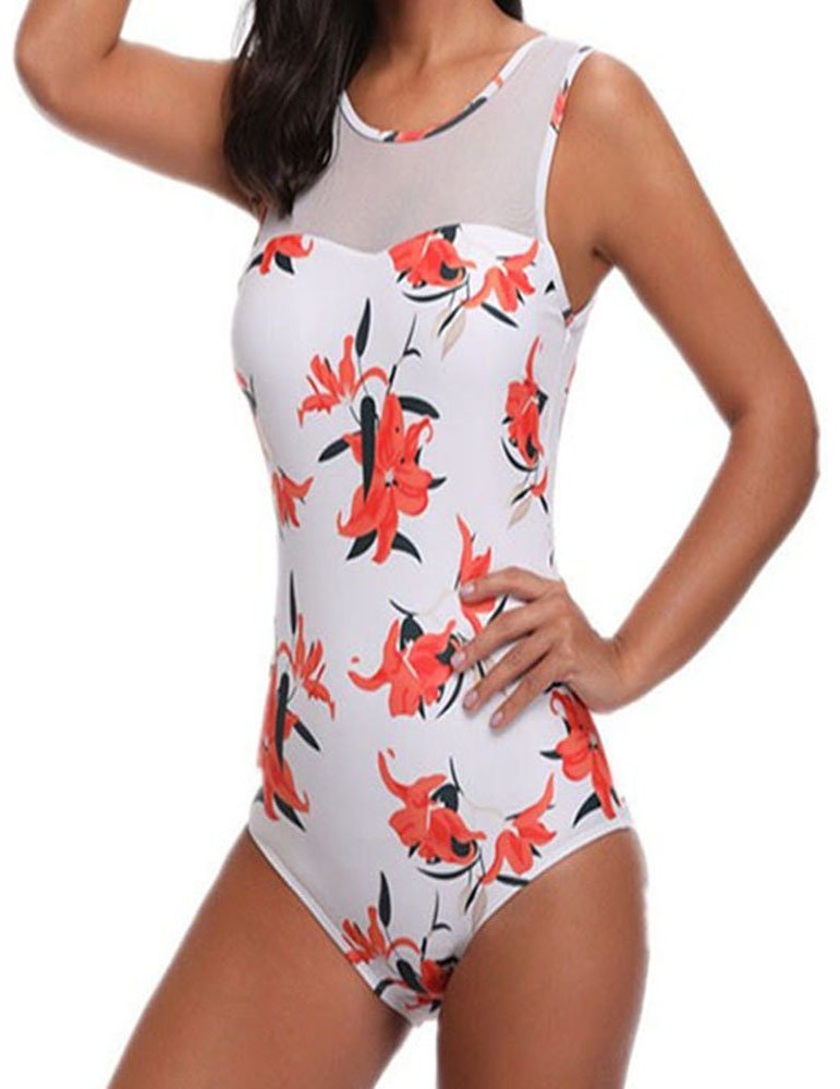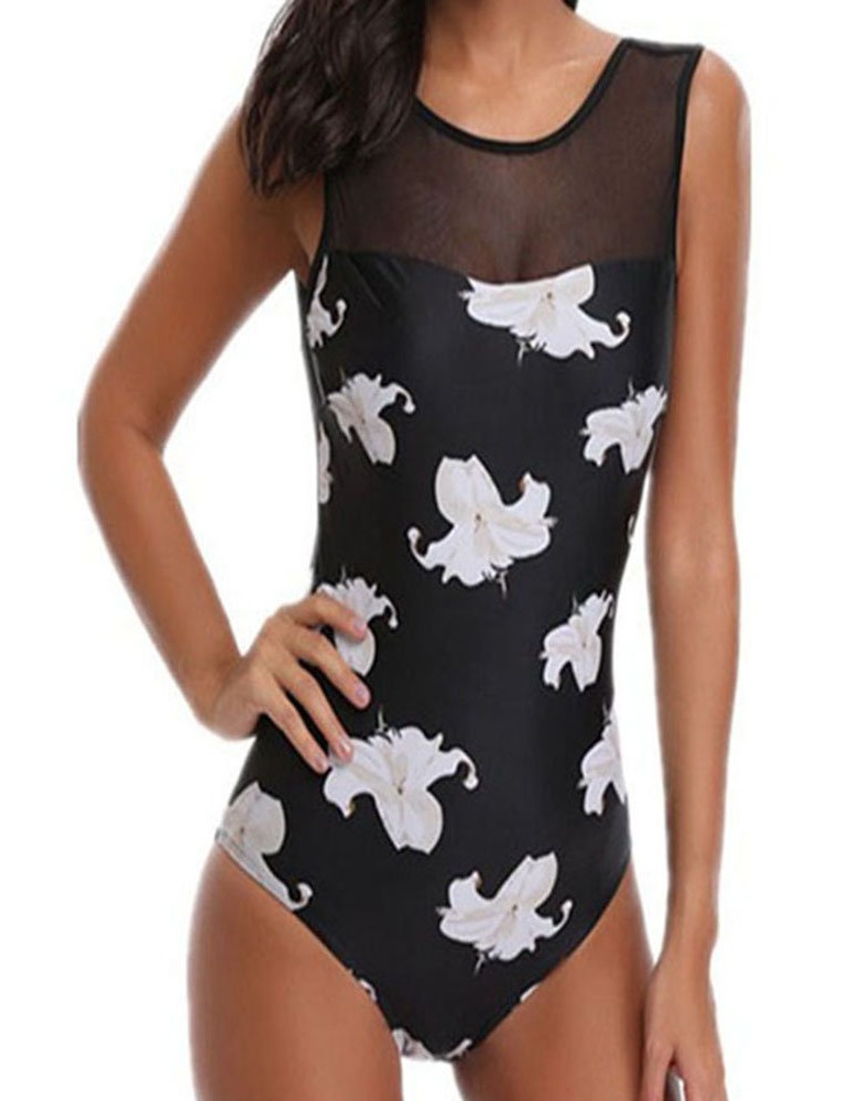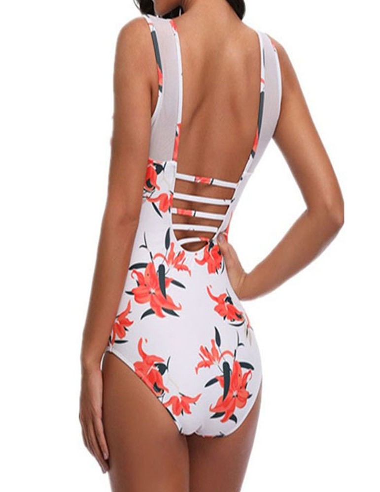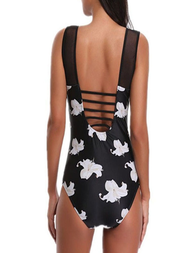 Patchwork Mesh Printed U Back One Piece Swimwear For Women