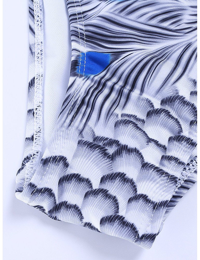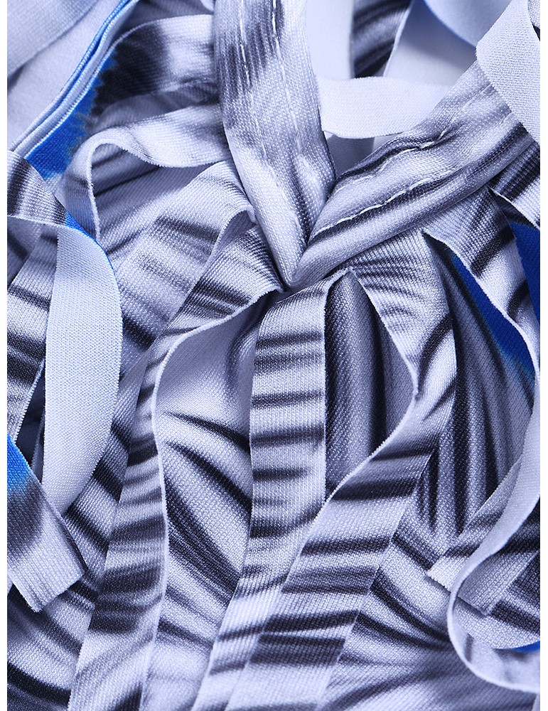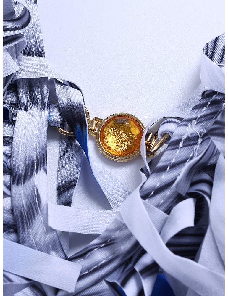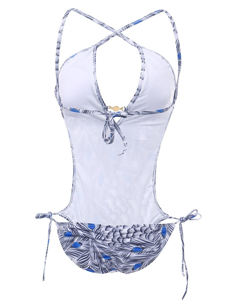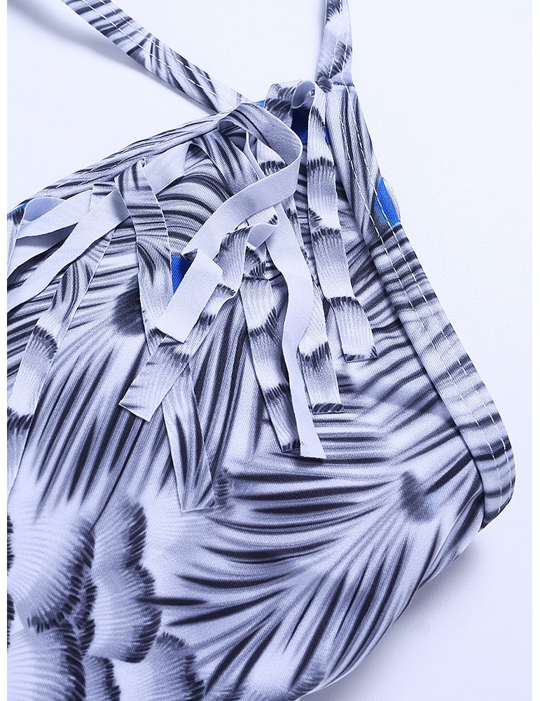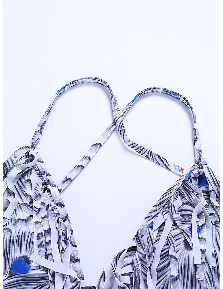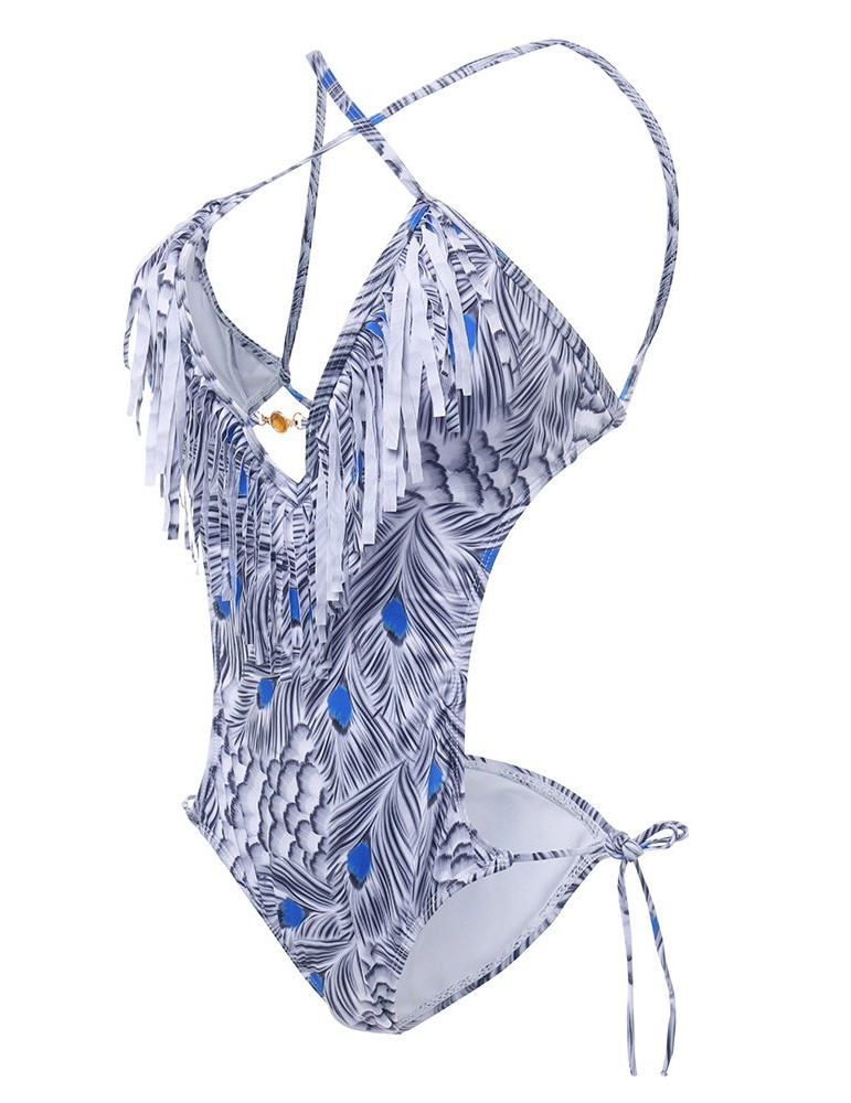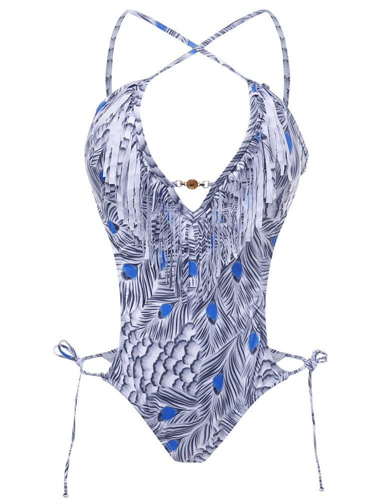Printed Tassel Deep V Lacing Adjustable One Piece Swimsuit Swimwear For Women