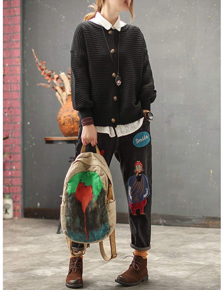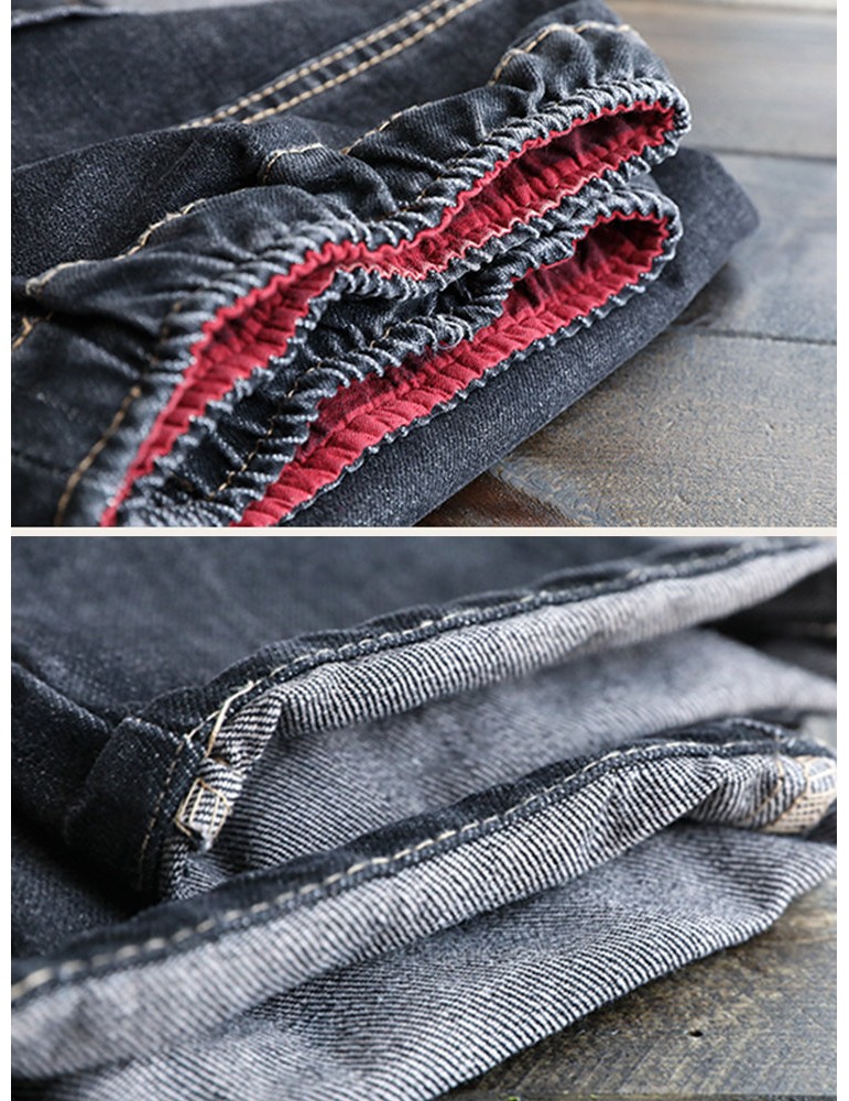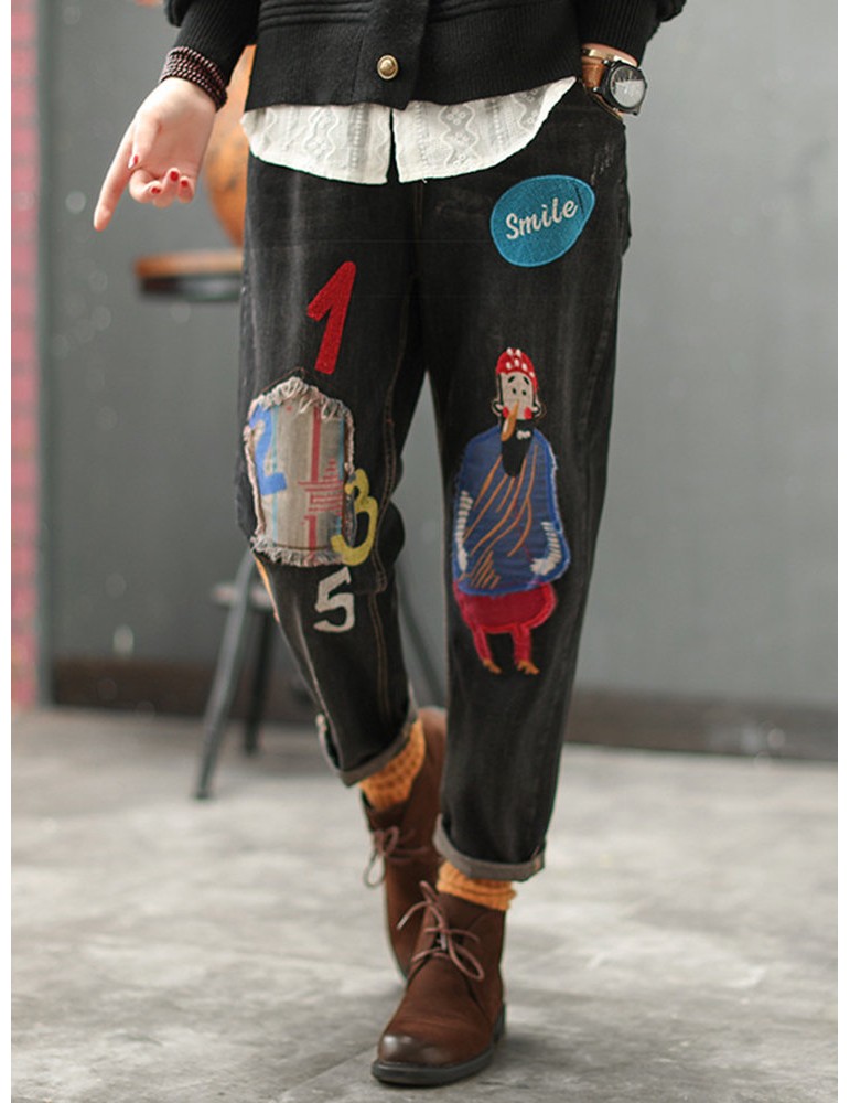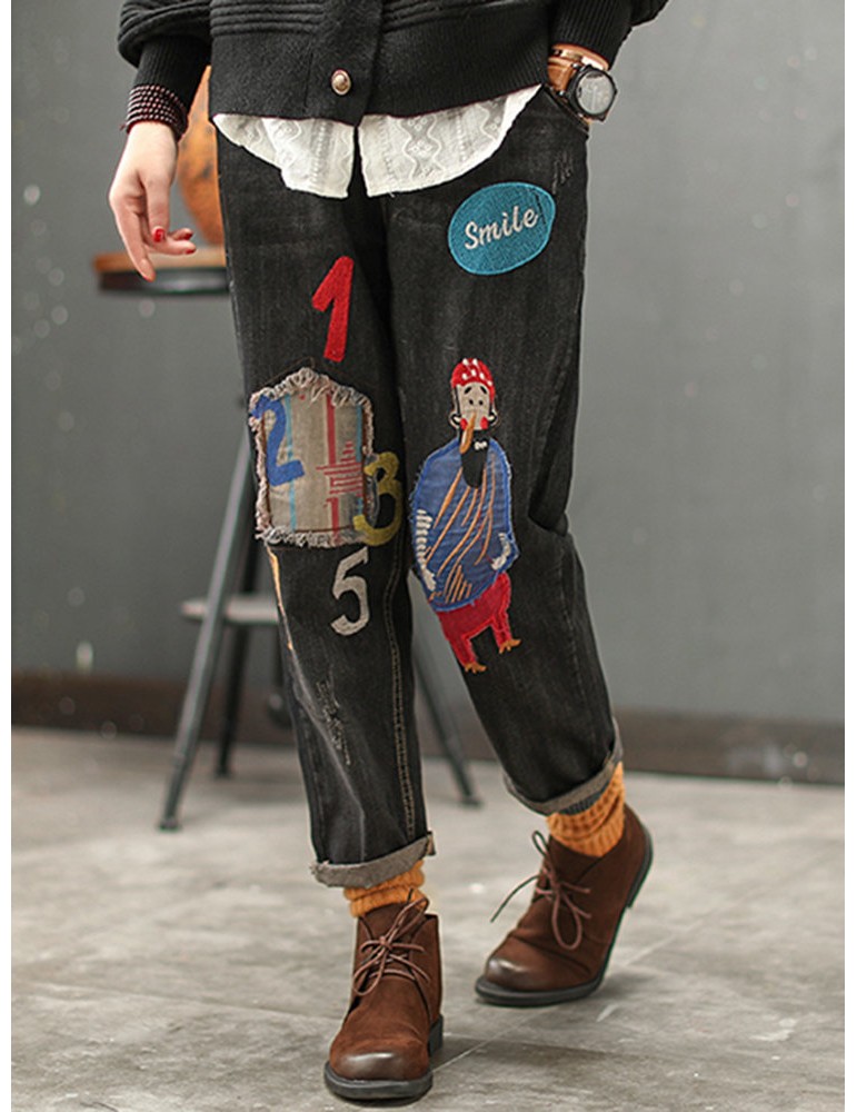 Vintage Patchwork Elastic Waist Embroidery Denim