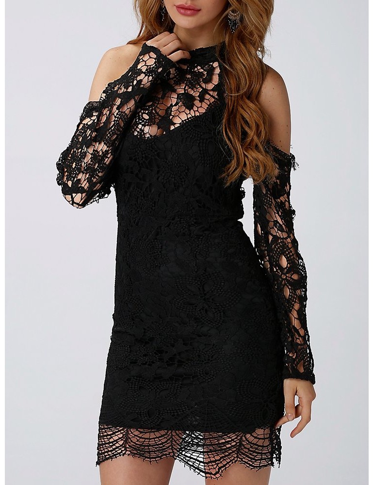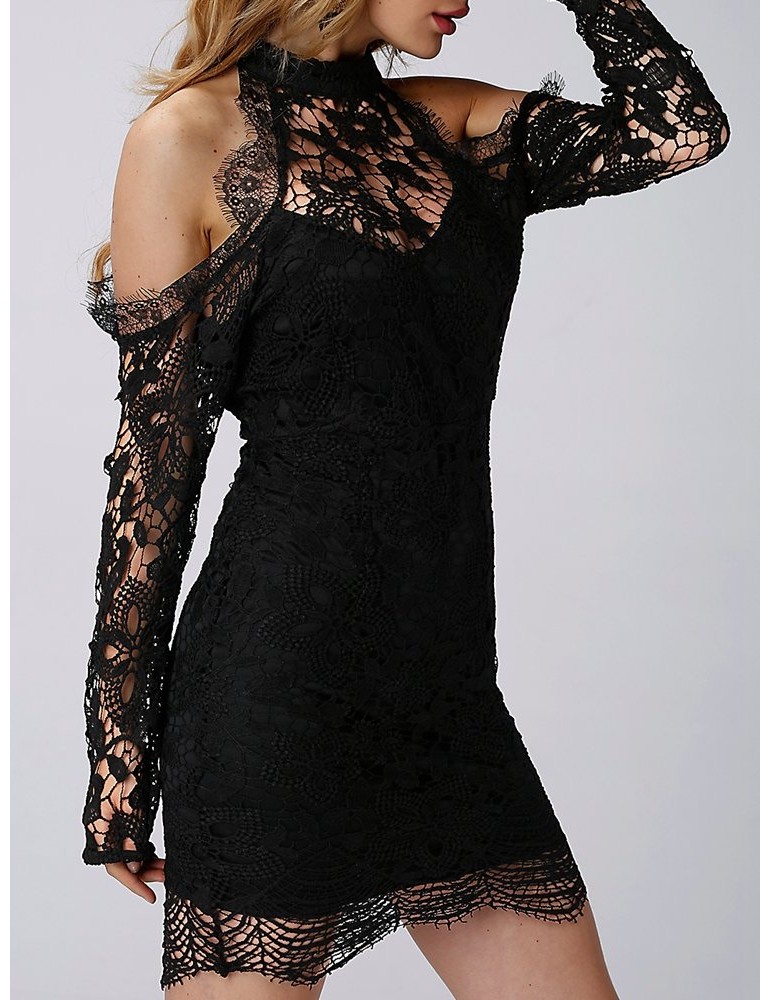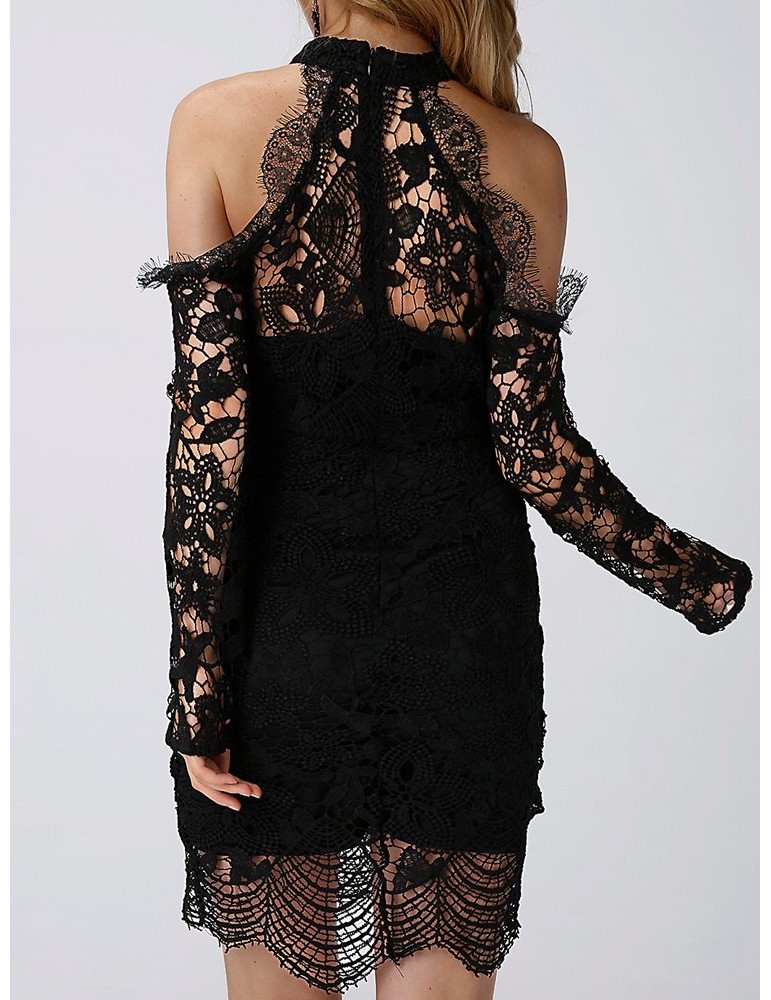 Cold Shoulder Lace Long Sleeve Stand Collar Women Dress