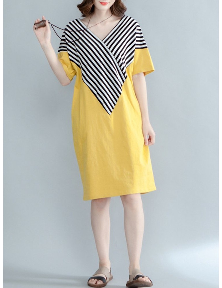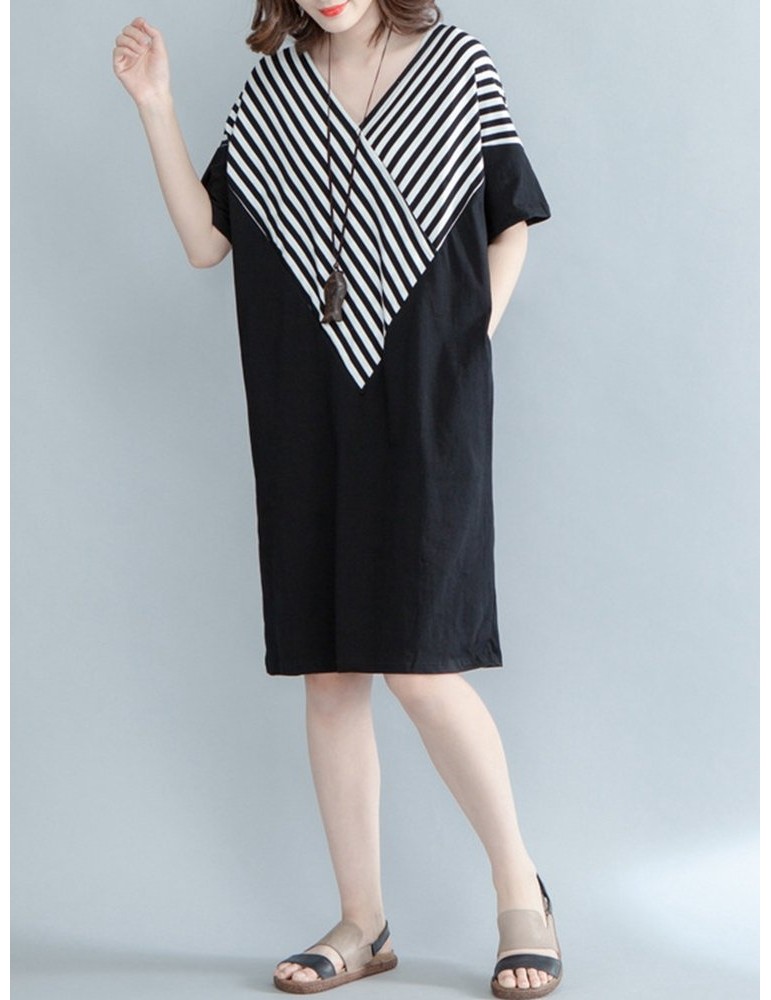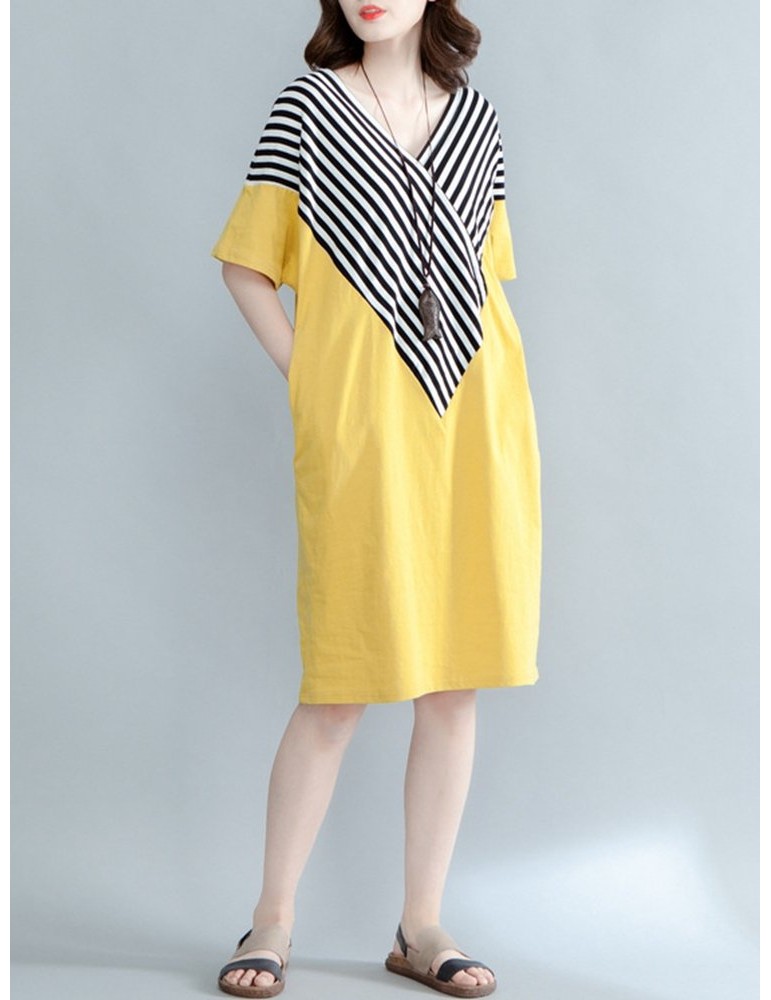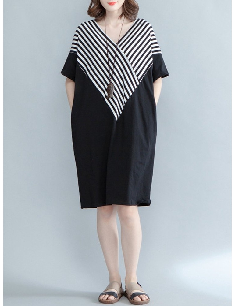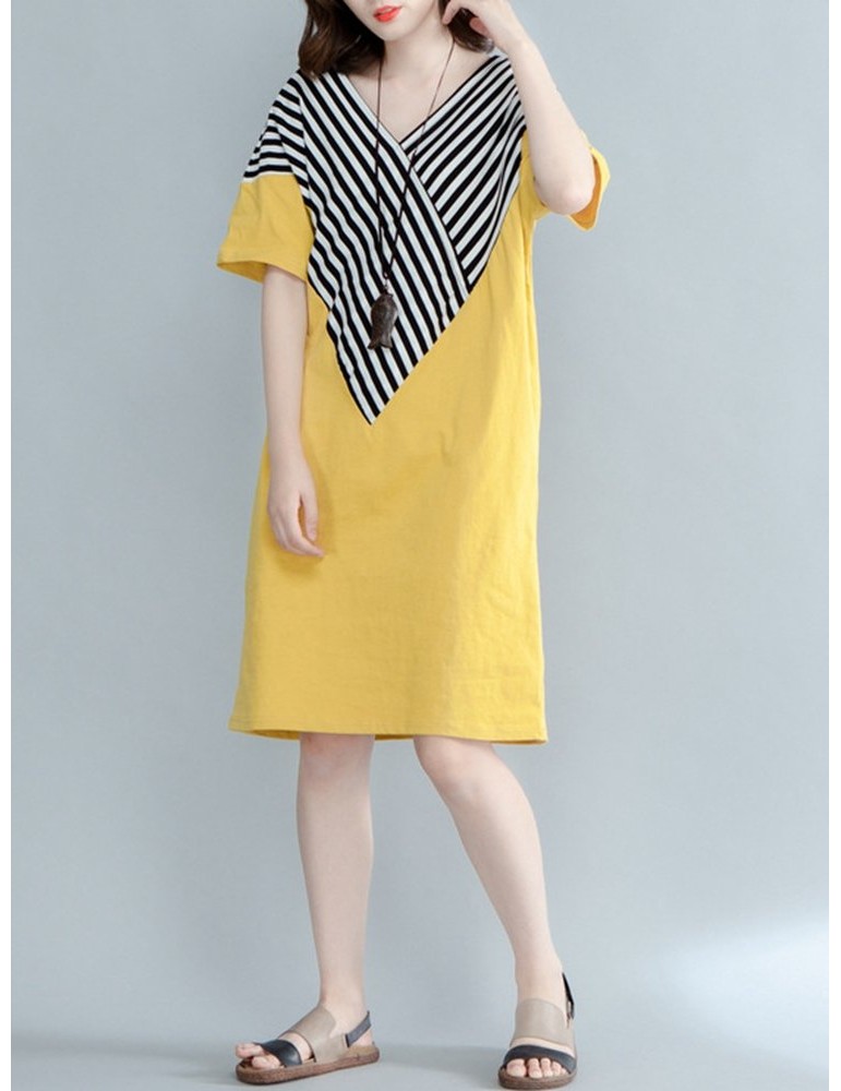 Casual Stripe Patchwork Loose Half Sleeve V-neck Women Dress