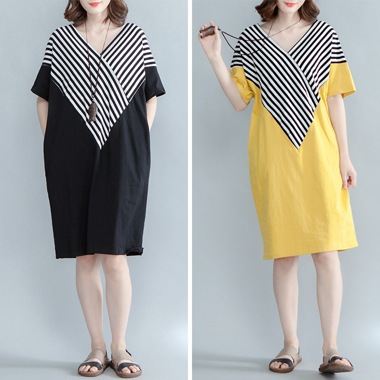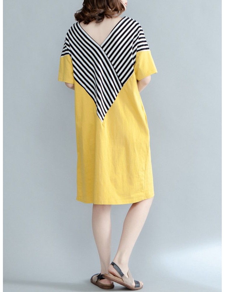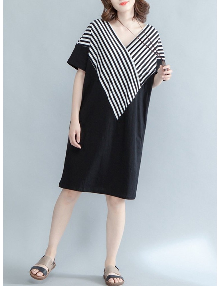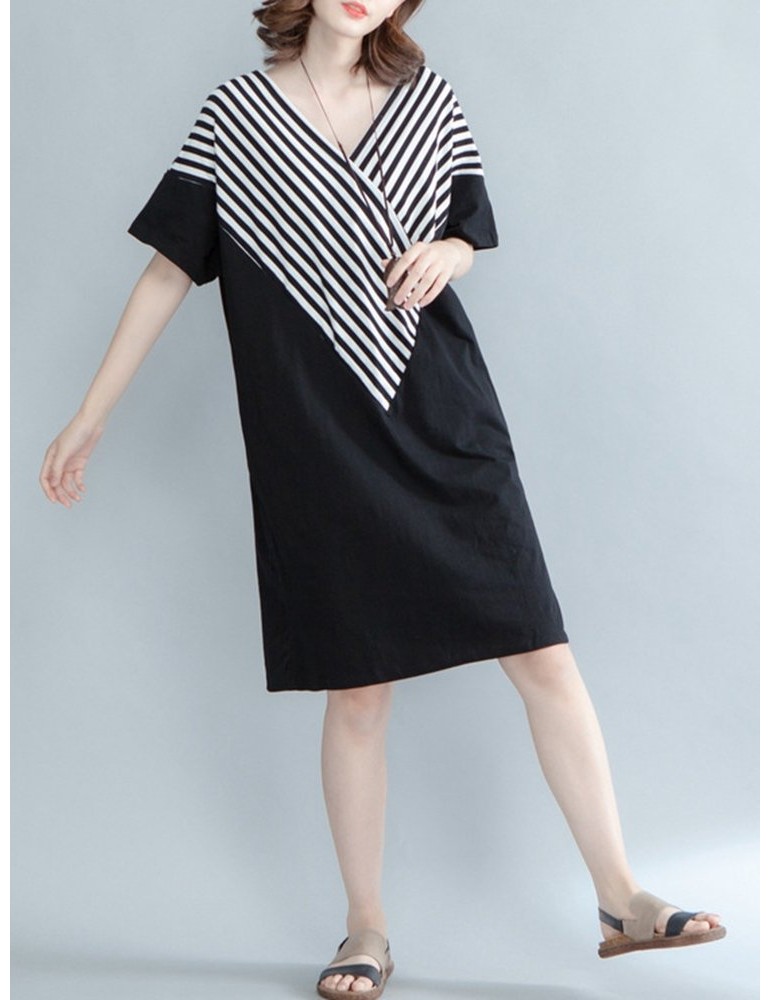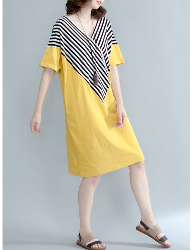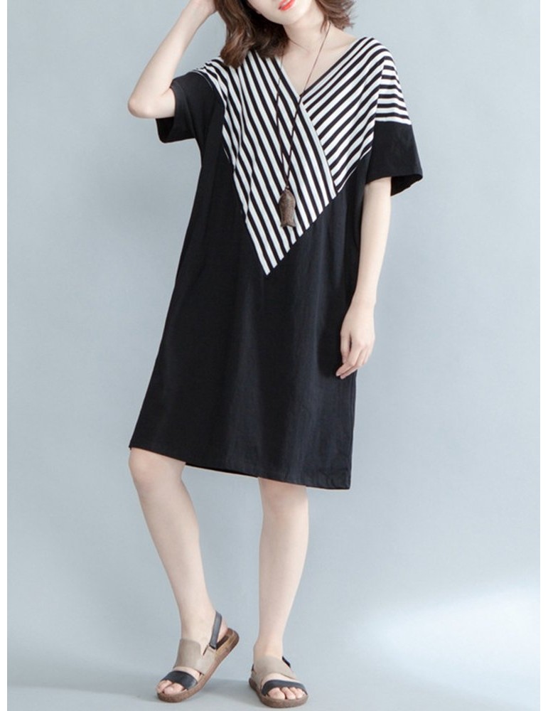 Casual Stripe Patchwork Loose Half Sleeve V-neck Women Dress