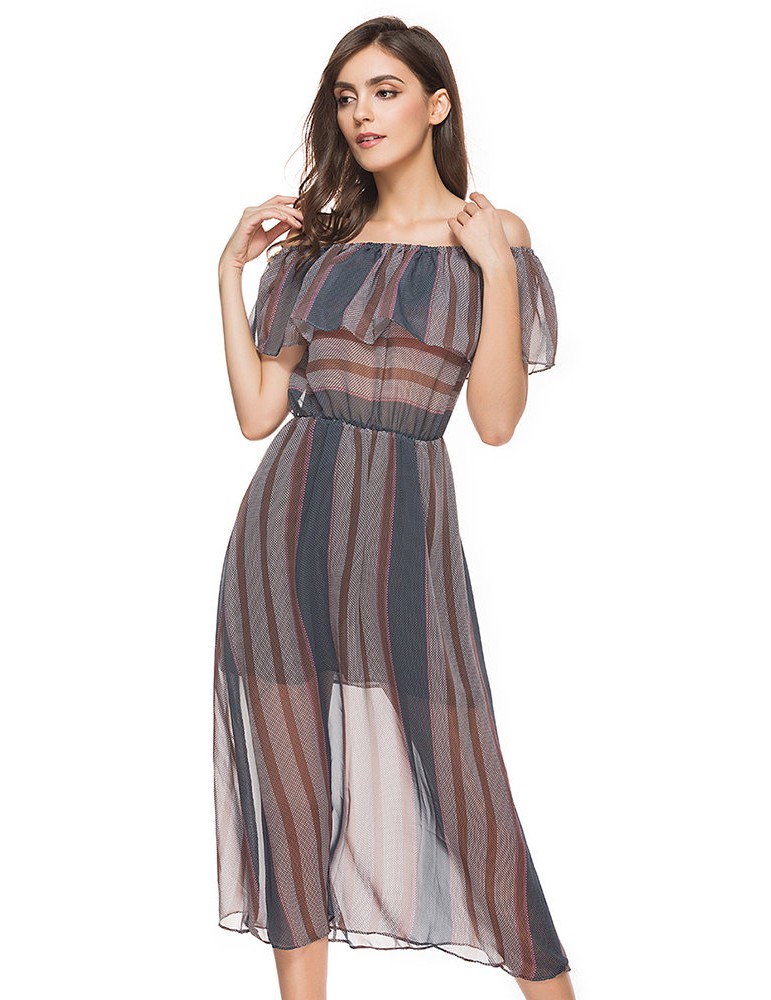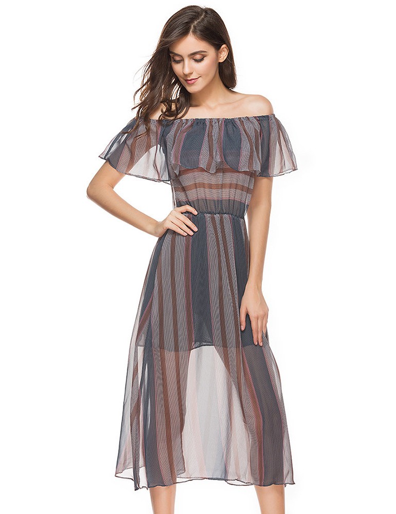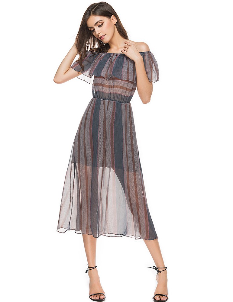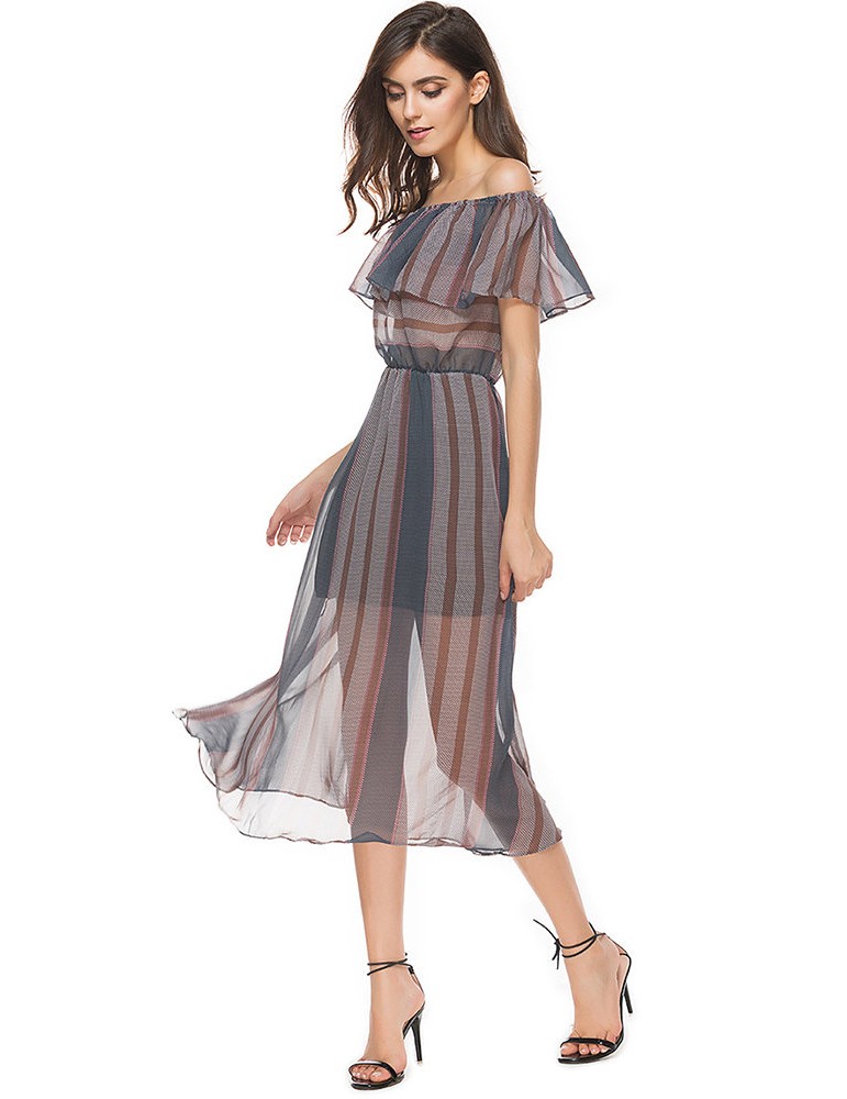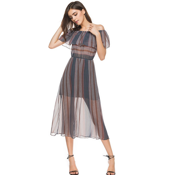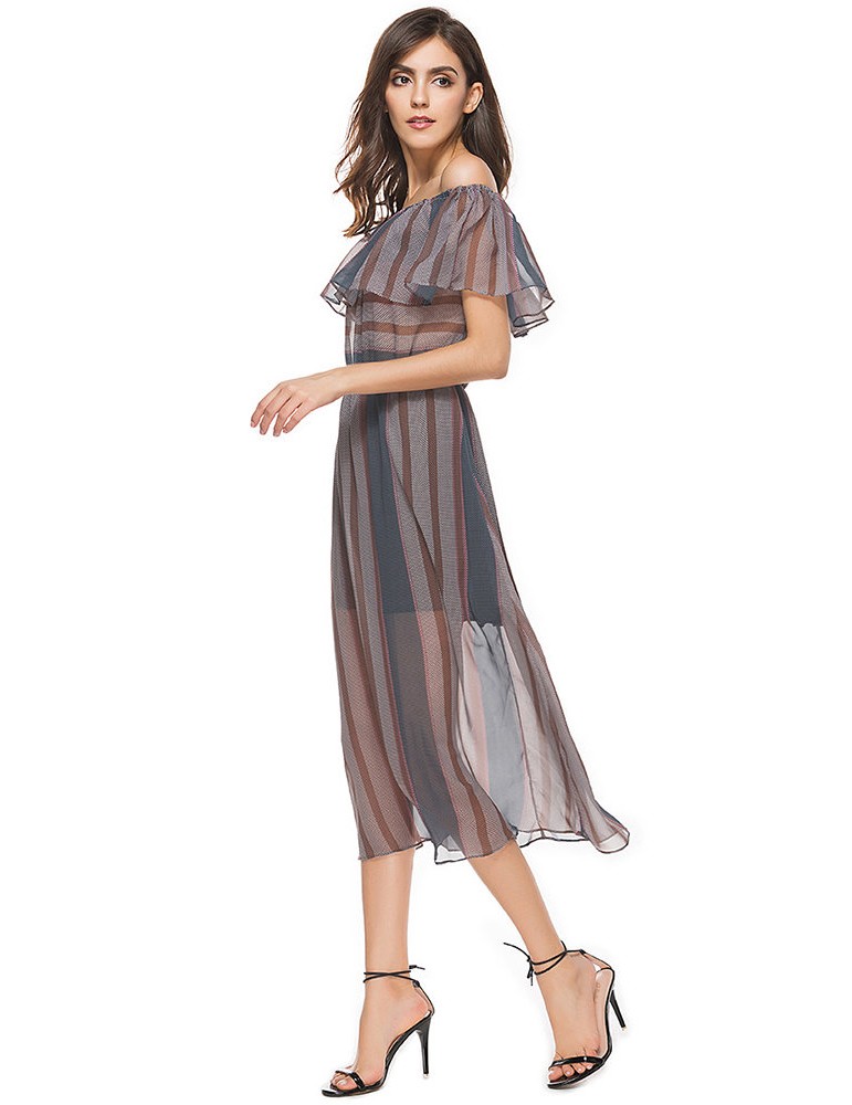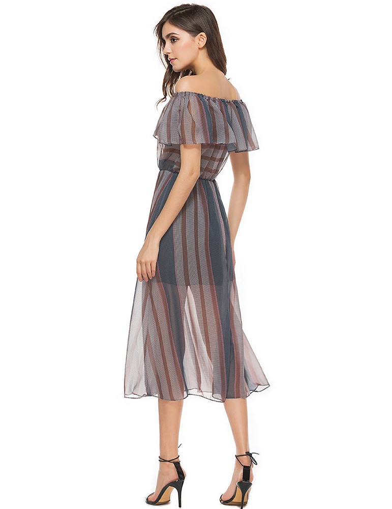 Chiffon Women Off Shoulder Sleeveless Striped Print Dresses