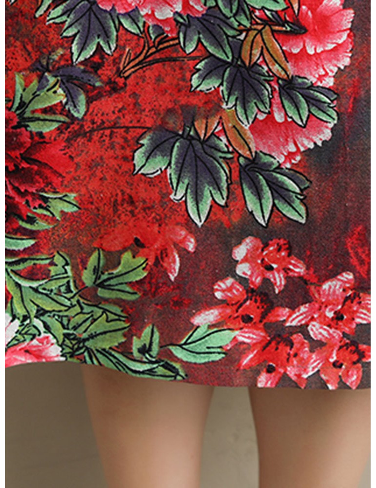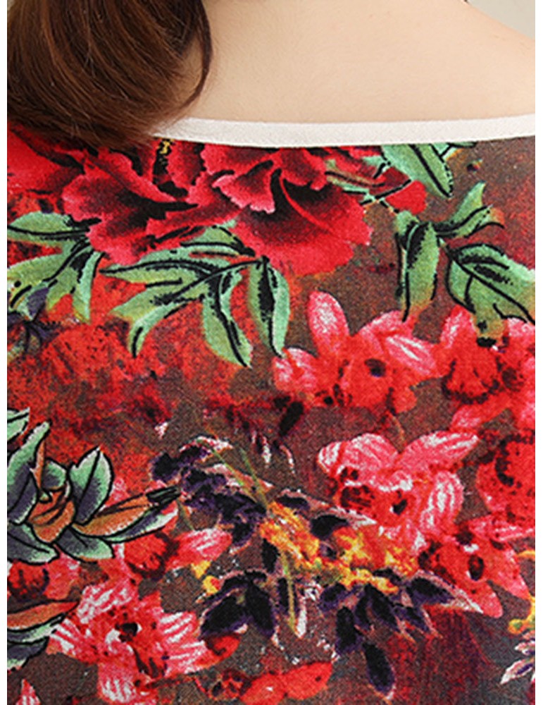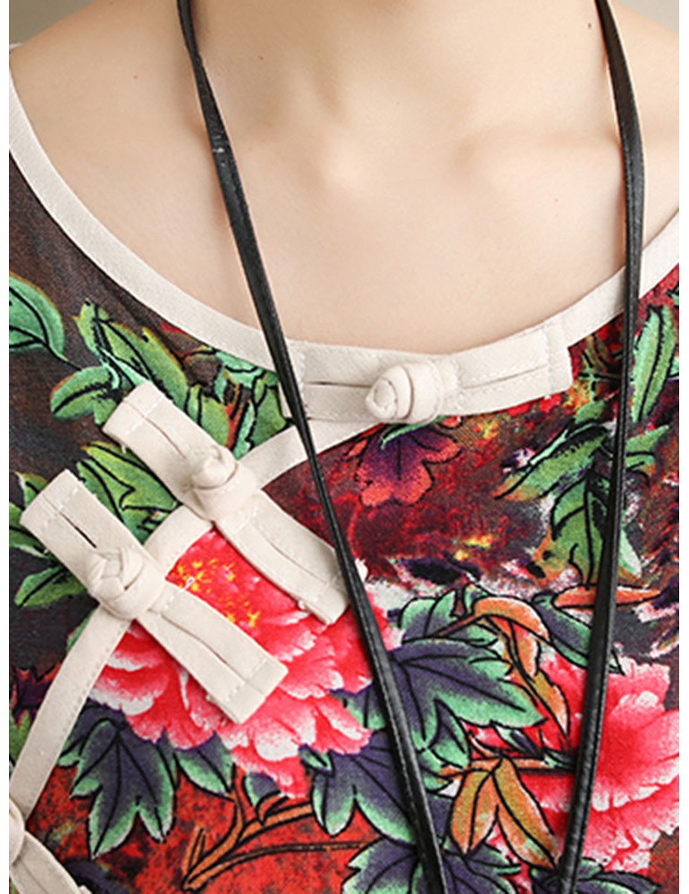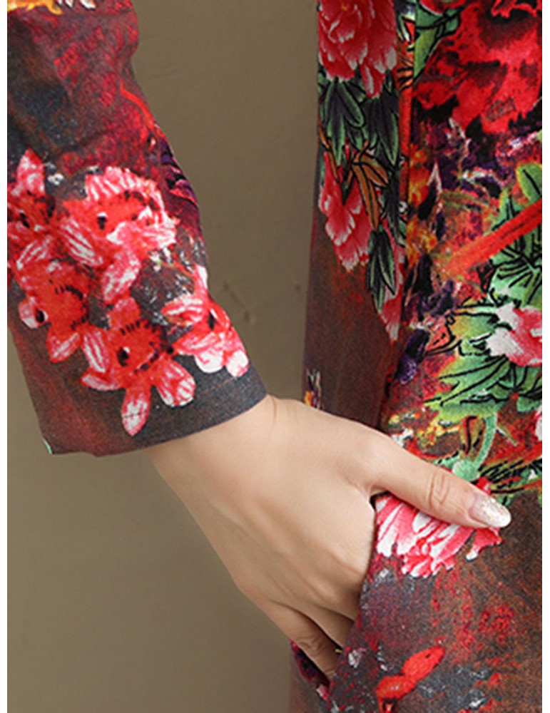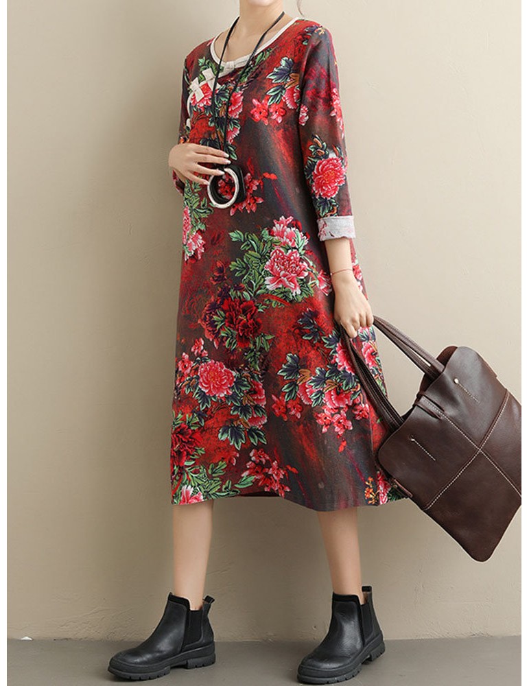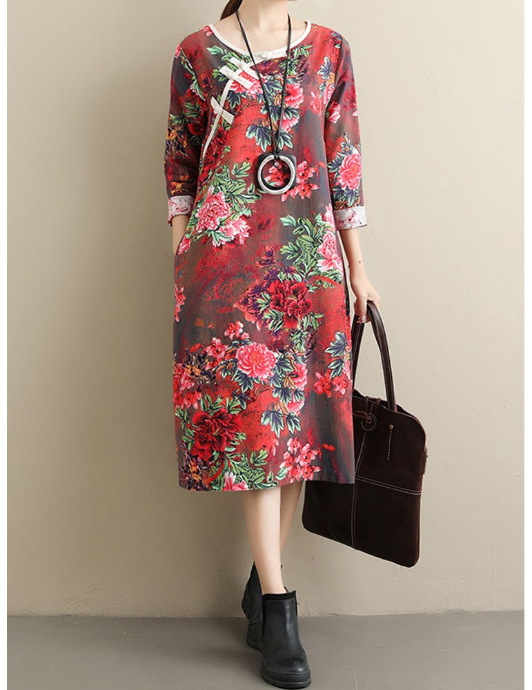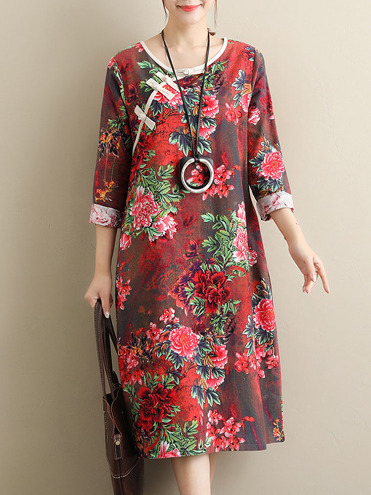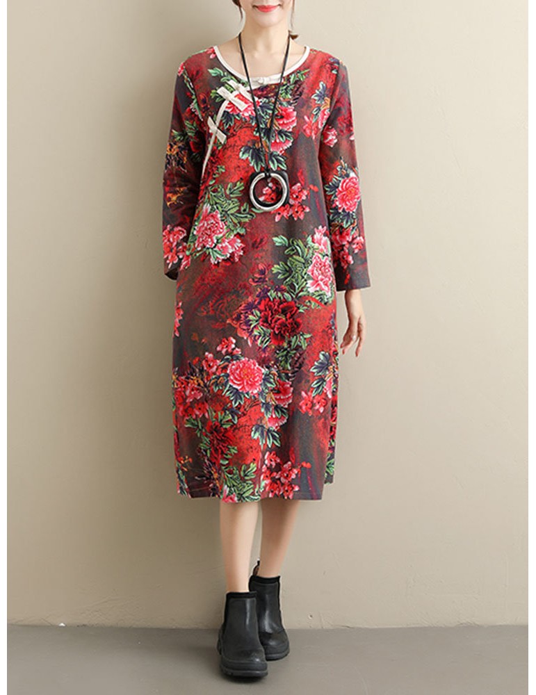 Loose Floral Print Frog Button Long Sleeve Vintage Dresses