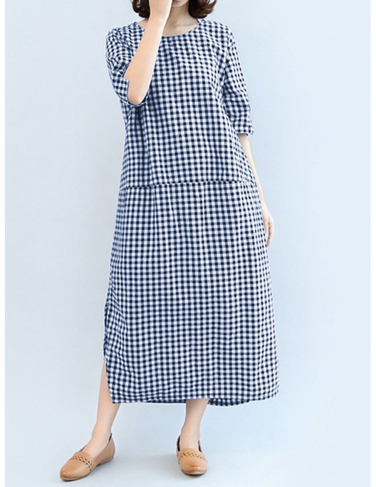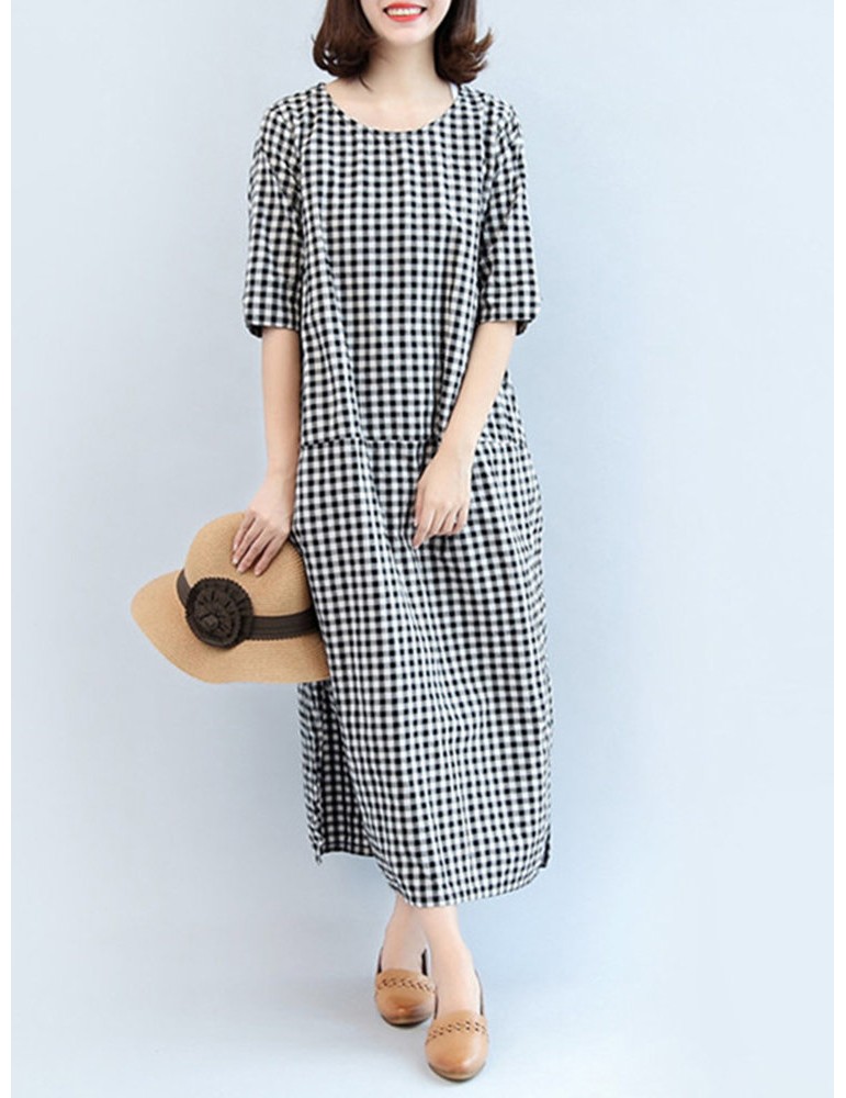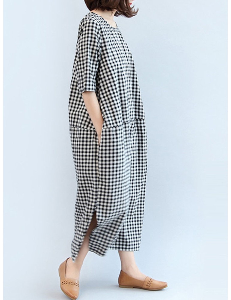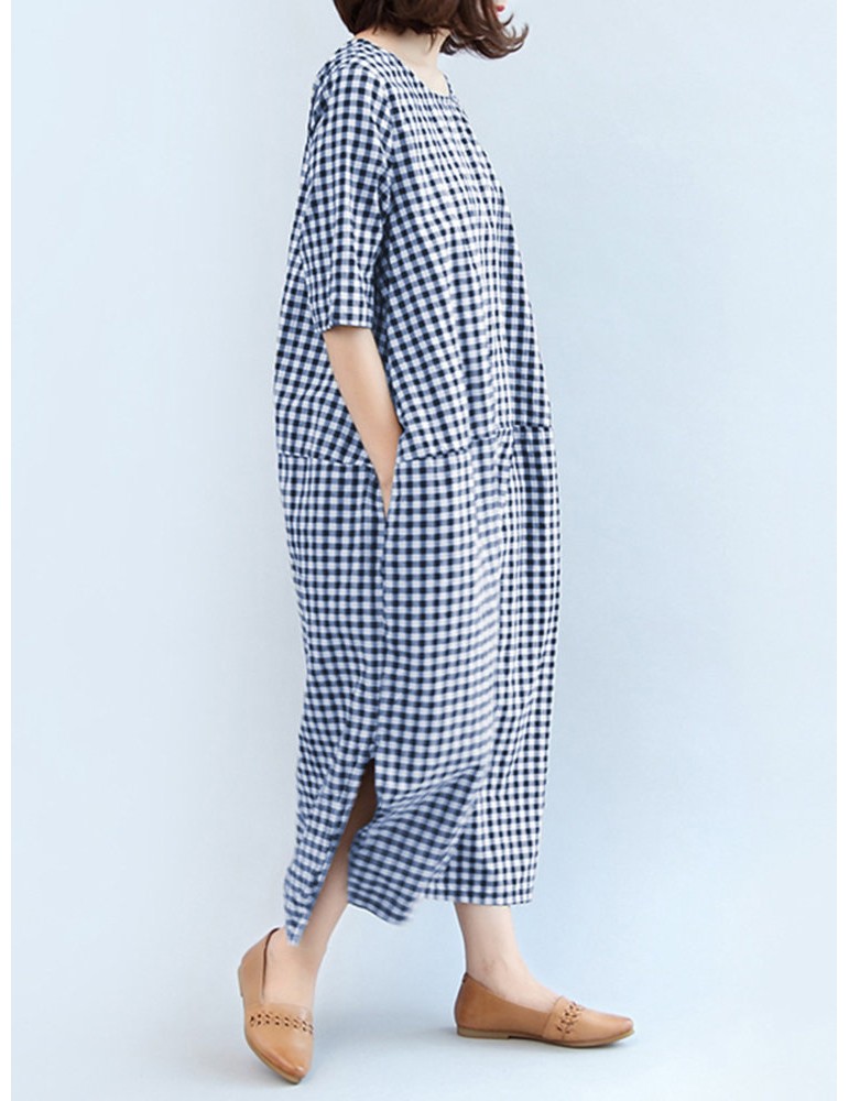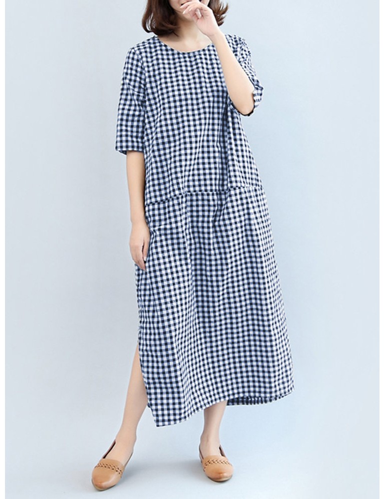 Plaid Print Side Splited Loose Half Sleeve Vintage Dresses