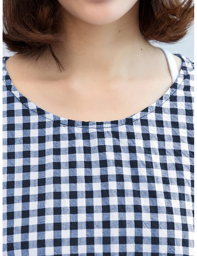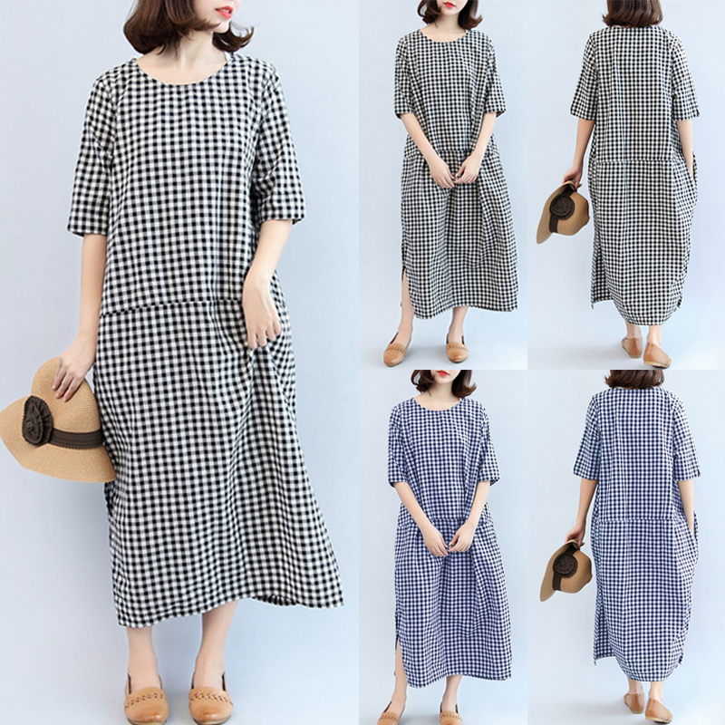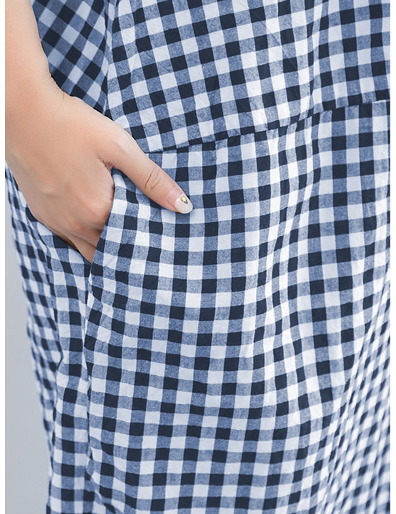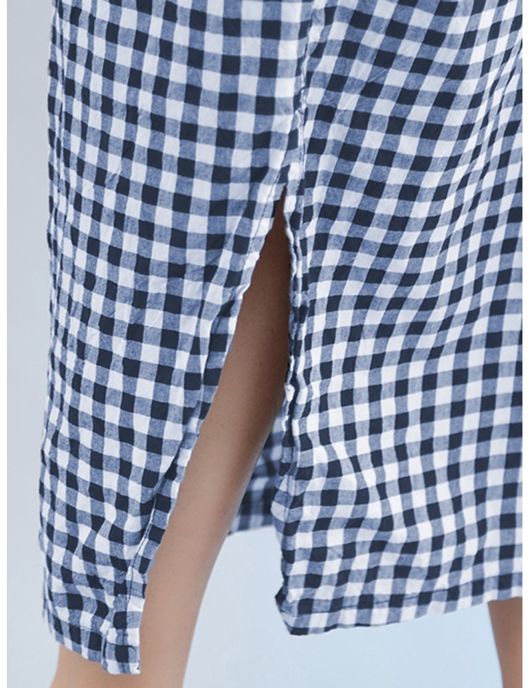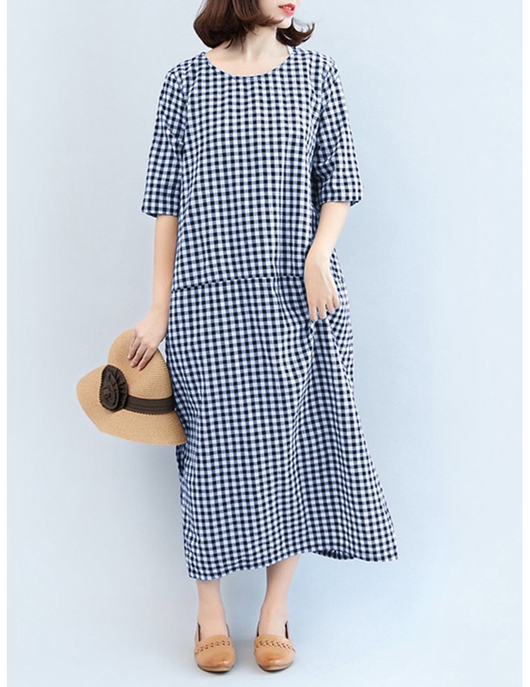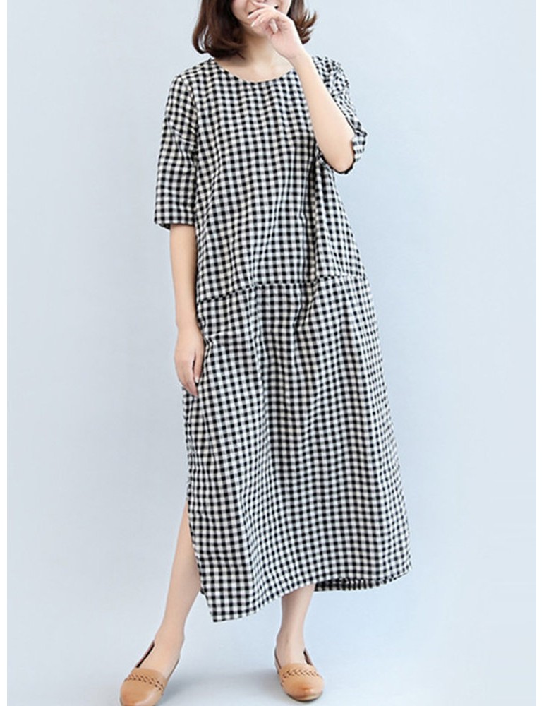 Plaid Print Side Splited Loose Half Sleeve Vintage Dresses