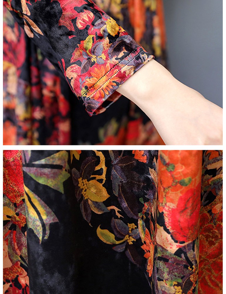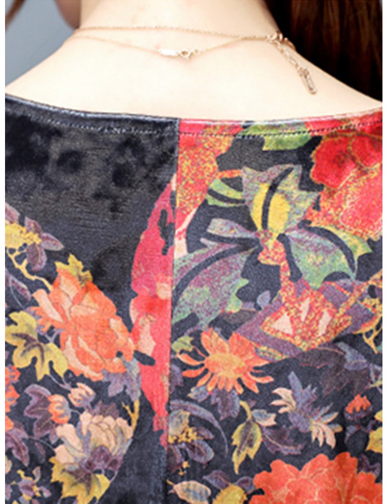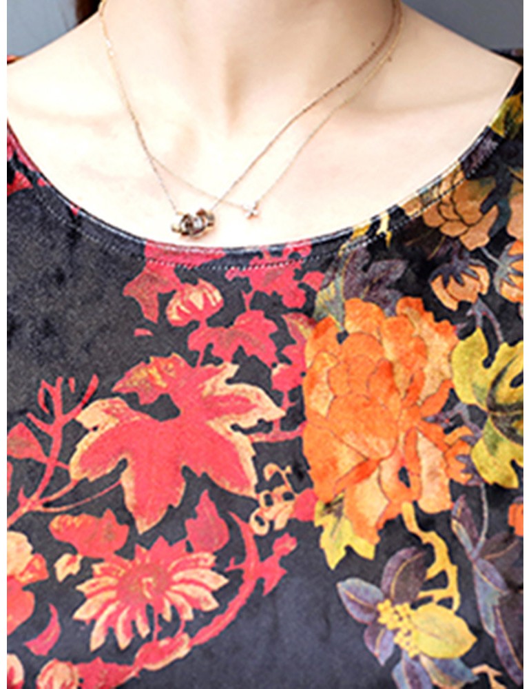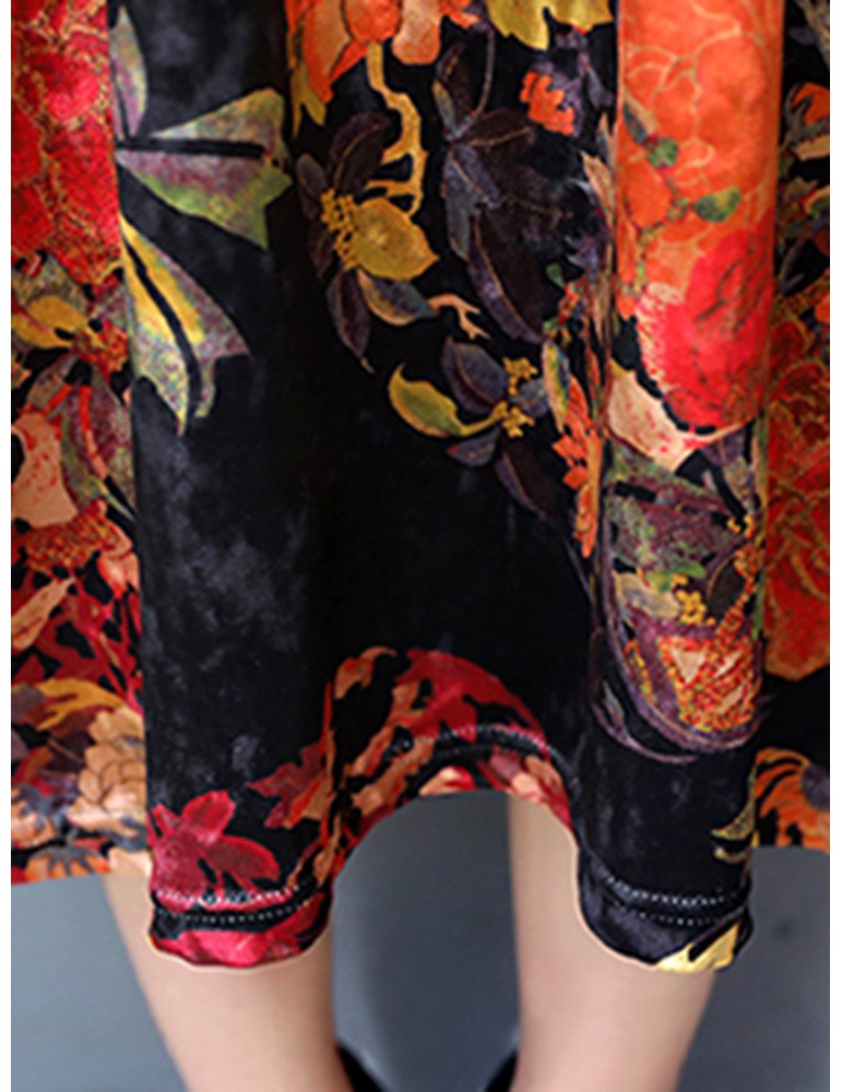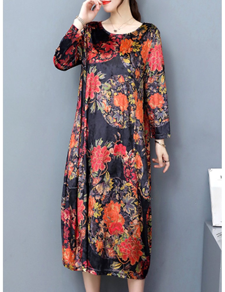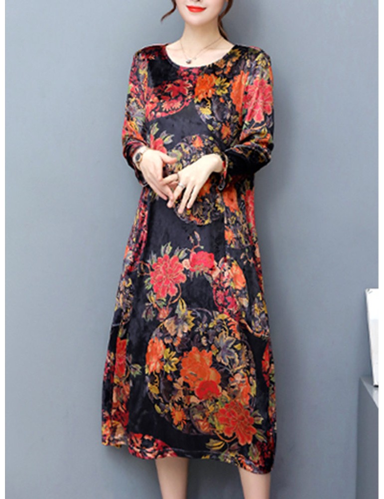 Floral Printd O-Neck Long Sleeve Vintage Dresses For Women