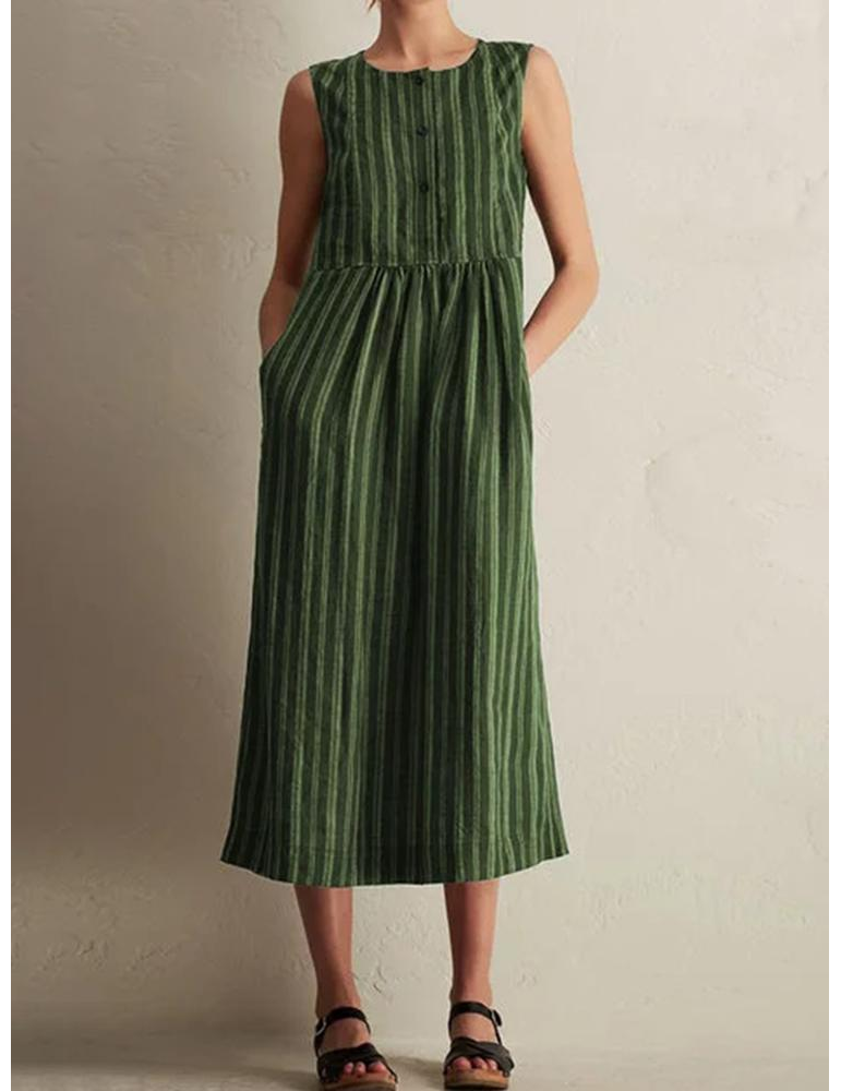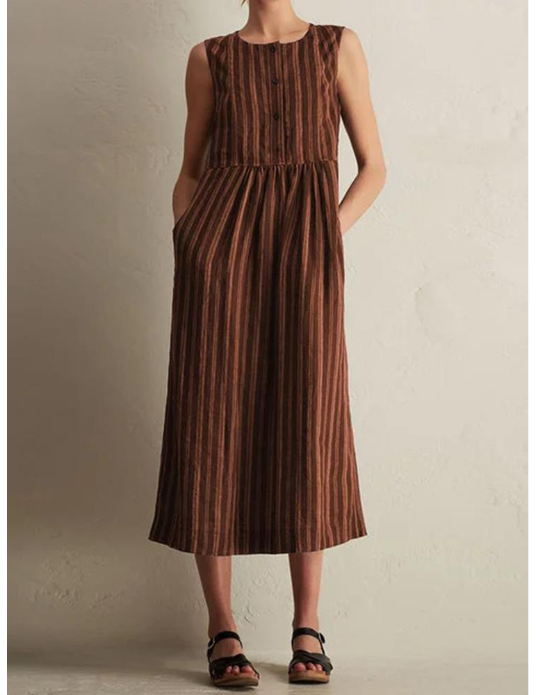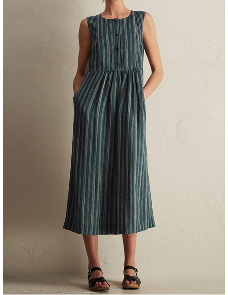 Pockets Stripe Sleeveless Vintage Mid-calf Dress For Women