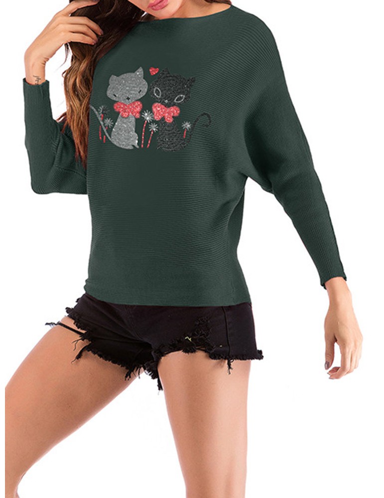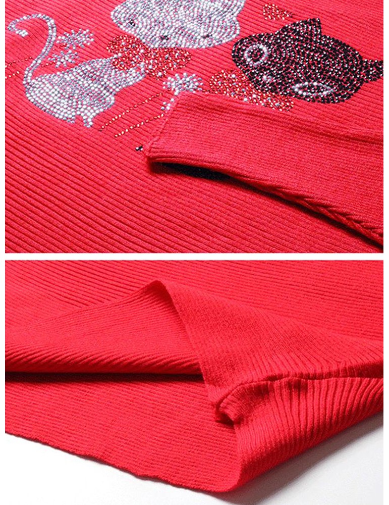 Knit Rhinestones Cats Long Sleeve Crew Neck Sweater