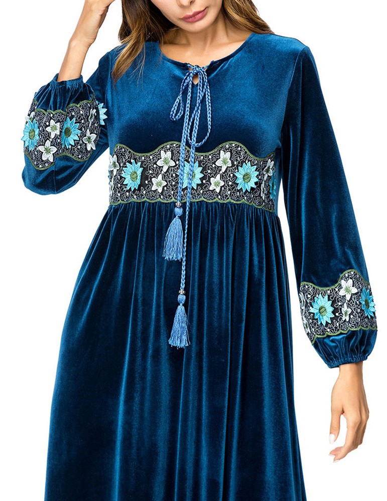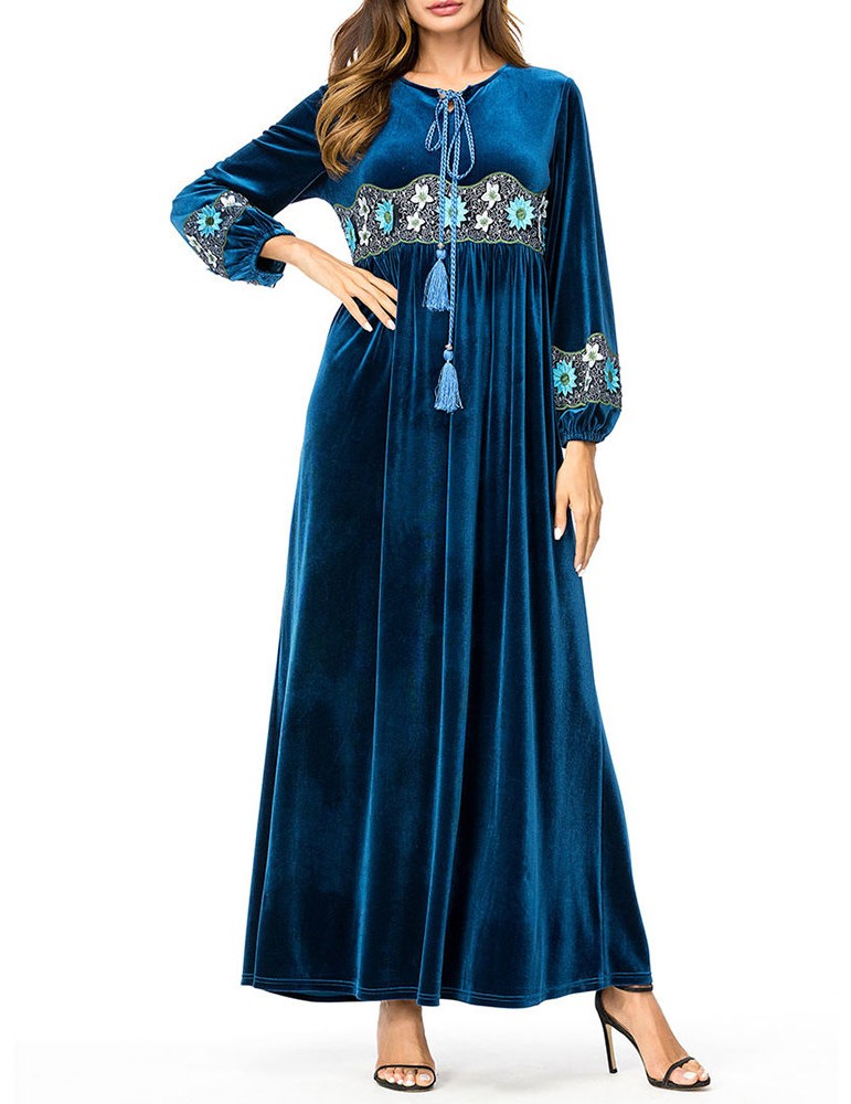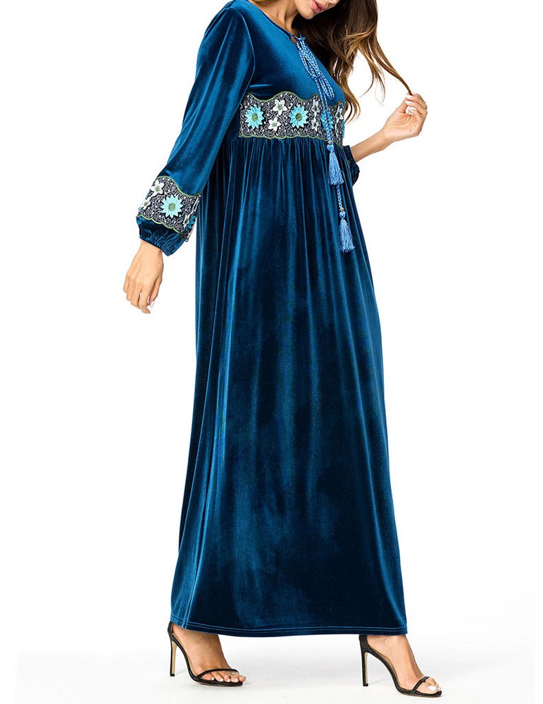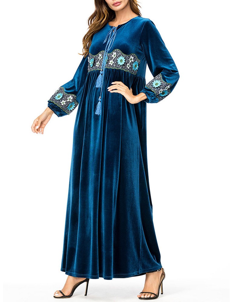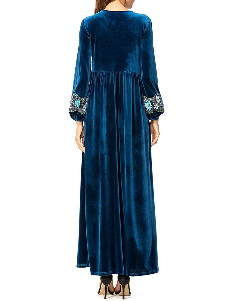 Velvet Embroidery Long Sleeve Navy Muslim Long Dress